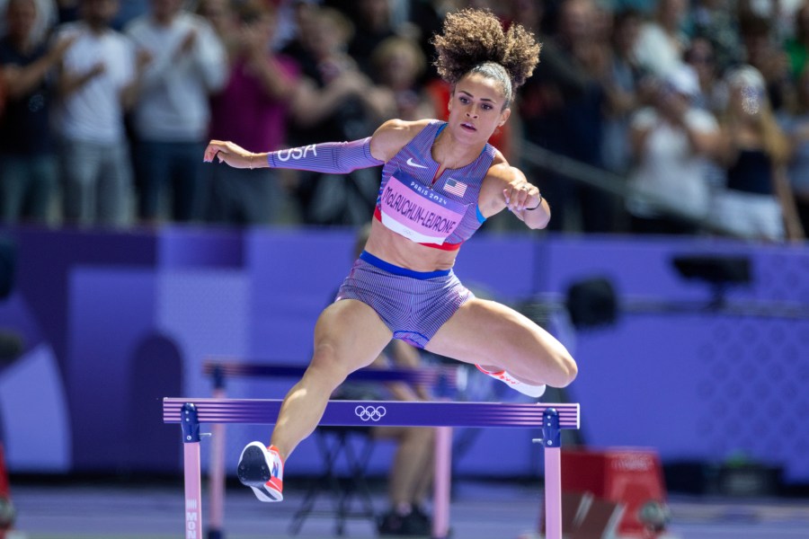 PARIS, FRANCE: AUGUST 04: Sydney McLaughlin-Levrone of the United States in action in the Women's 400m Hurdles round one heat five during the Athletics Competition at the Stade de France during the Paris 2024 Summer Olympic Games on August 4th, 2024, in Paris, France. (Photo by Tim Clayton/Corbis via Getty Images)