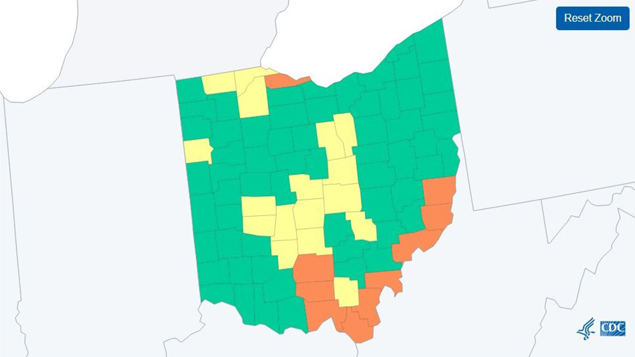 A majority 61 of 88 Ohio counties are now green on the CDC’s map, while 17 mostly in central Ohio are yellow. Ten counties mostly on the Ohio River are orange.