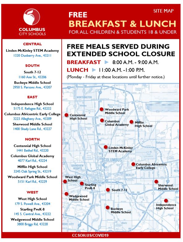 While schools are closed because of the coronavirus, anyone under 18 in Columbus can stop by 13 different sites to pick up breakfast and lunch for free.