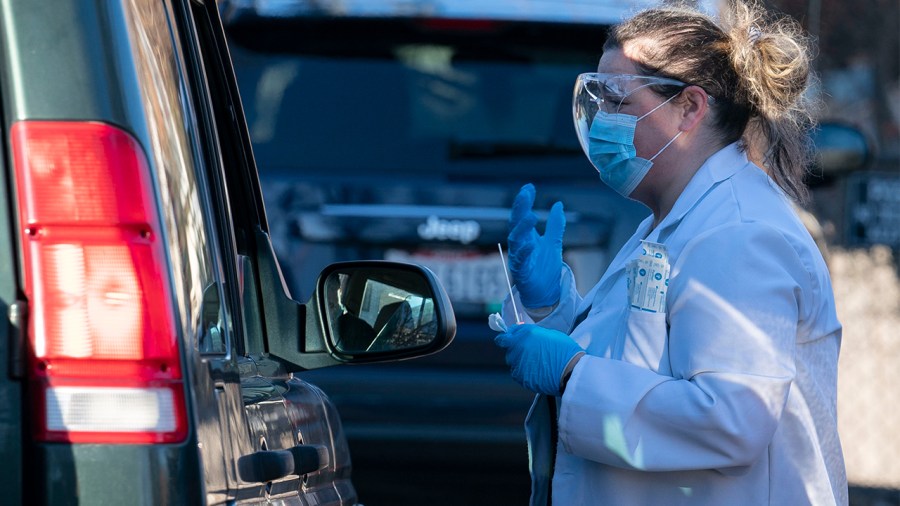 A healthcare worker attends to people waiting at a COVID testing site in Cincinnati, Monday, Jan. 3, 2022. (AP Photo/Jeff Dean)