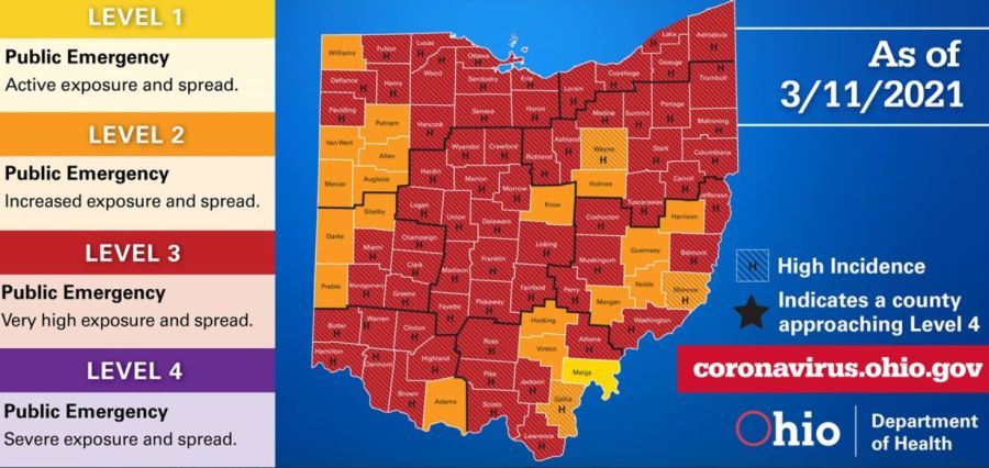 In the latest map released Thursday, a total of 21 counties are orange (level 2), with 66 being red. Meigs County is the lone yellow (level 1) in the state this week.