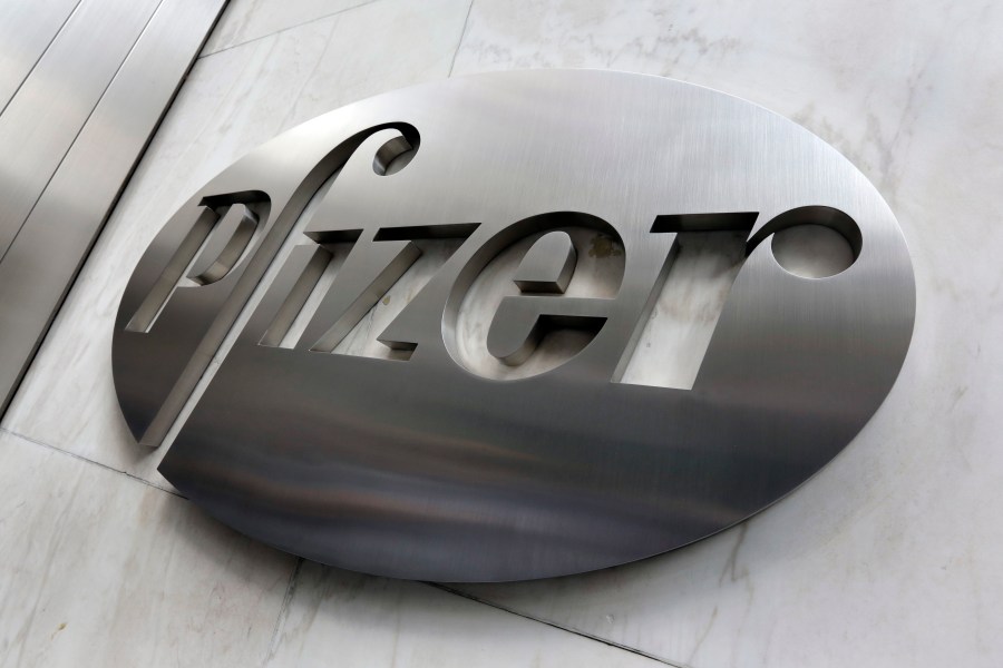File- This Dec. 4, 2017, photo shows the Pfizer company logo at the company's headquarters in New York. The federal government has agreed to pay nearly $2 billion for 100 million doses of a potential COVID-19 vaccine being developed by the U.S. drugmaker and its German partner BioNTech. (AP Photo/Richard Drew, File)