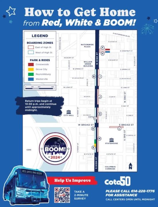 from designated Red, White & BOOM! boarding zones along High Street from State Street to Nationwide Boulevard at 10:30 p.m.,11 p.m., 11:30 p.m. and midnight.