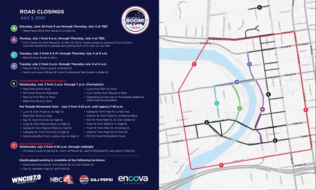 COLUMBUS, Ohio (WCMH) – Over 400,000 people are expected to come Downtown for the biggest fireworks show in the Midwest: Red, White & BOOM! and there will be several road closures and parking options for those making their way to Downtown.