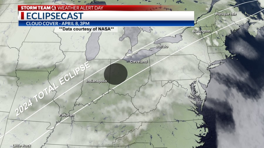 The current forecast does not call for rain showers anywhere in central Ohio. Turning to the cloud cover, models are suggesting partly to mostly sunny skies. The trick will be dodging the few clouds that will be in the skies by 3 p.m. next Monday.