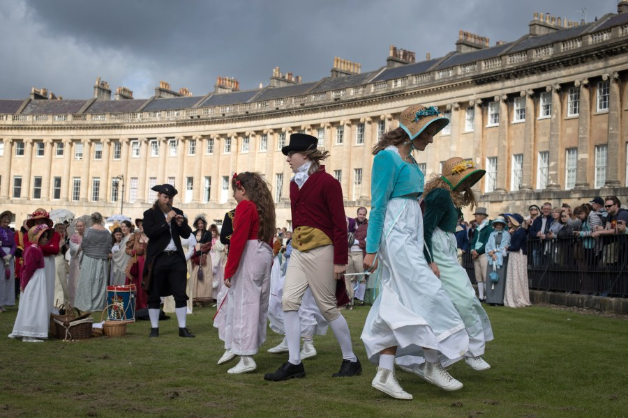 BATH, UNITED KINGDOM - SEPTEMBER 09: Participants in the annual Jane Austen Regency Costumed Parade dance on the lawn of the historic Georgian Royal Crescent before they walk through the city centre on September 9, 2017 in Bath, England. This year, the annual event coincided with the 200th anniversary of 19th century author's death and saw hundreds of people parade through city centre streets dressed in regency costume. The event marks the start of a 10-day Jane Austen festival that celebrates the 19th century author who lived in the city from 1801 to 1806 and set two of her six published novels, 'Northanger Abbey' and 'Persuasion', in Bath. (Photo by Matt Cardy/Getty Images)
