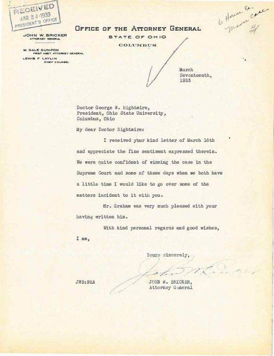 Rightmire forwarded those letters to the attorney general’s office in February 1933, as Bricker was preparing to submit Ohio State’s reply to Weaver’s complaint. Rightmire had previously sent along the university’s official points of argument in the case.