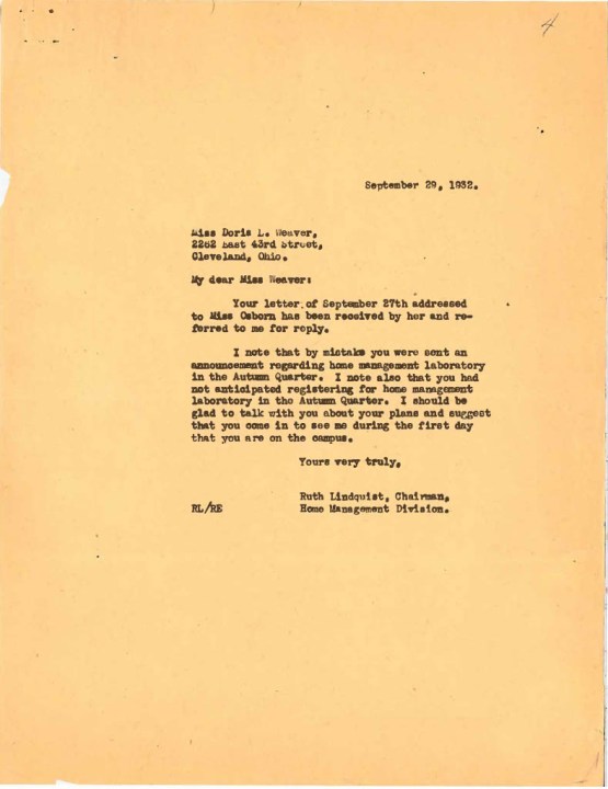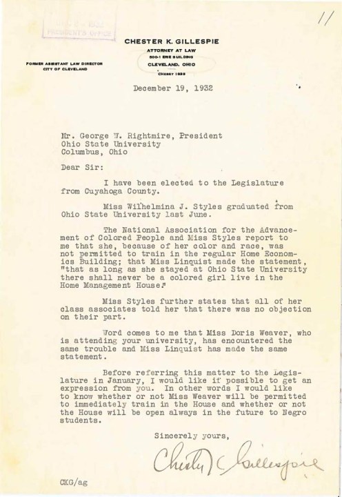 In a September 1932 letter, Styles wrote to Gillespie that the head of the Department of Home Management told her “that as long as she stayed at Ohio State University there shall never be a colored girl live in the Home Management House.”