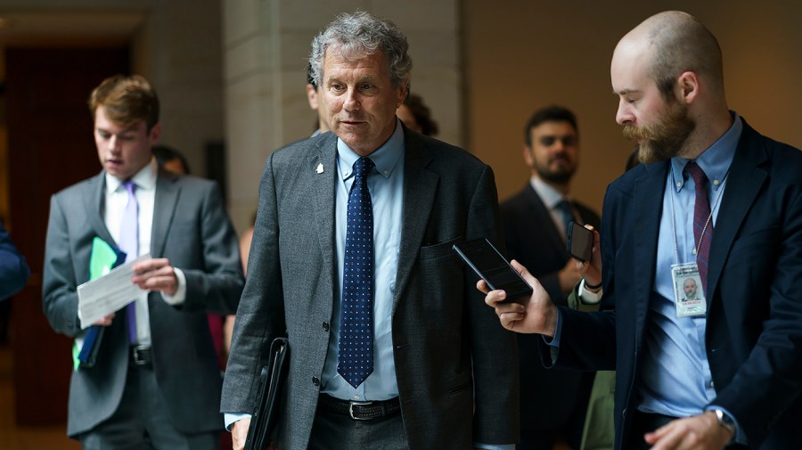 Sen. Sherrod Brown (D-Ohio) arrives for an all-Senators briefing at the Capitol to discuss artificial intelligence with defense and intelligence officials on Tuesday, July 11, 2023.