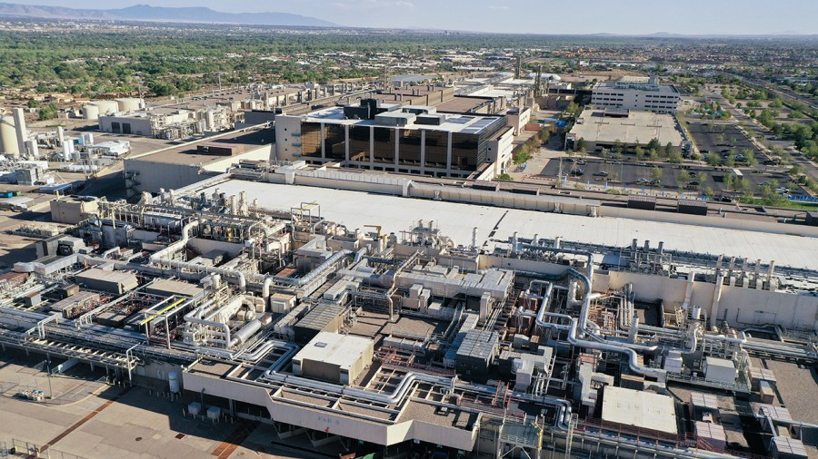An aerial view shows the Intel Rio Rancho campus in New Mexico, where Intel develops and manufactures technologies that optimize semiconductor packaging, memory, and connectivity. (Credit: Walden Kirsch/Intel Corporation)