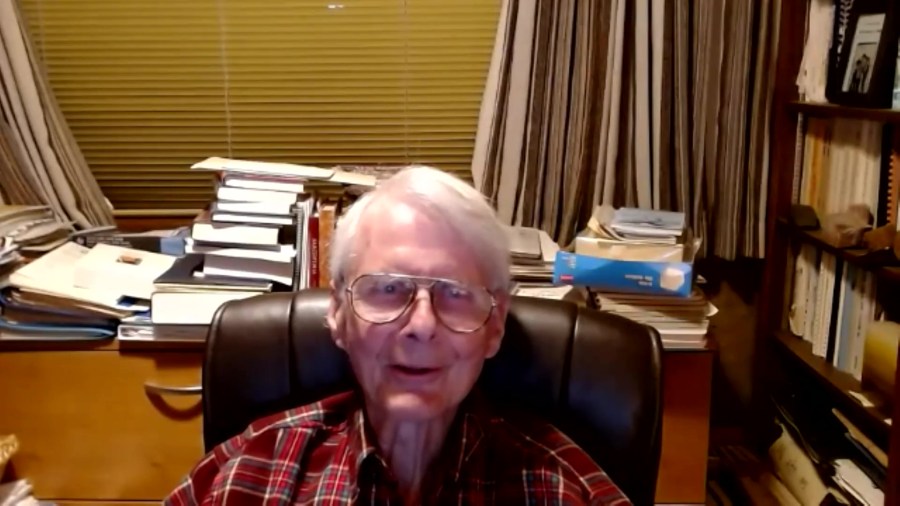 John Bartlit, acting chair of the Community Environmental Working Group, speaks during a meeting on Feb. 16, 2022. CEWG facilitates dialogue between Intel and people who live near its New Mexico semiconductor plant. (Screenshot/Zoom)
