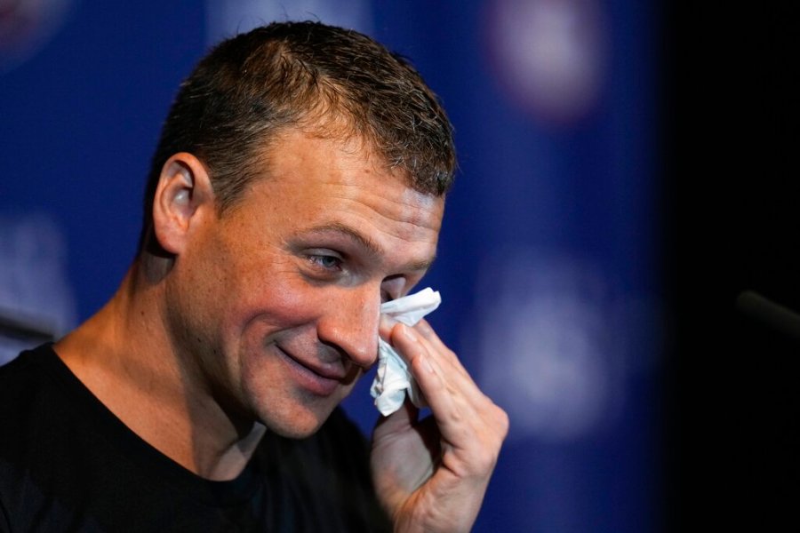 Ryan Lochte crys during an interview after the men's 200 individual medley during wave 2 of the U.S. Olympic Swim Trials on Friday, June 18, 2021, in Omaha, Neb. (AP Photo/Jeff Roberson)