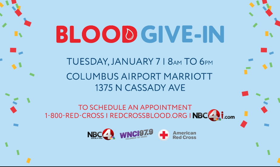 NBC4 will once again partner with WNCI and the American Red Cross to hold our annual blood drive on Tuesday, Jan. 7, 2025, from 8 a.m. to 6 p.m. The NBC4 WNCI Blood Give-in will be held at the Columbus Airport Marriott, located at 1375 N. Cassady Ave., Columbus, OH 43219 (just off I-670).