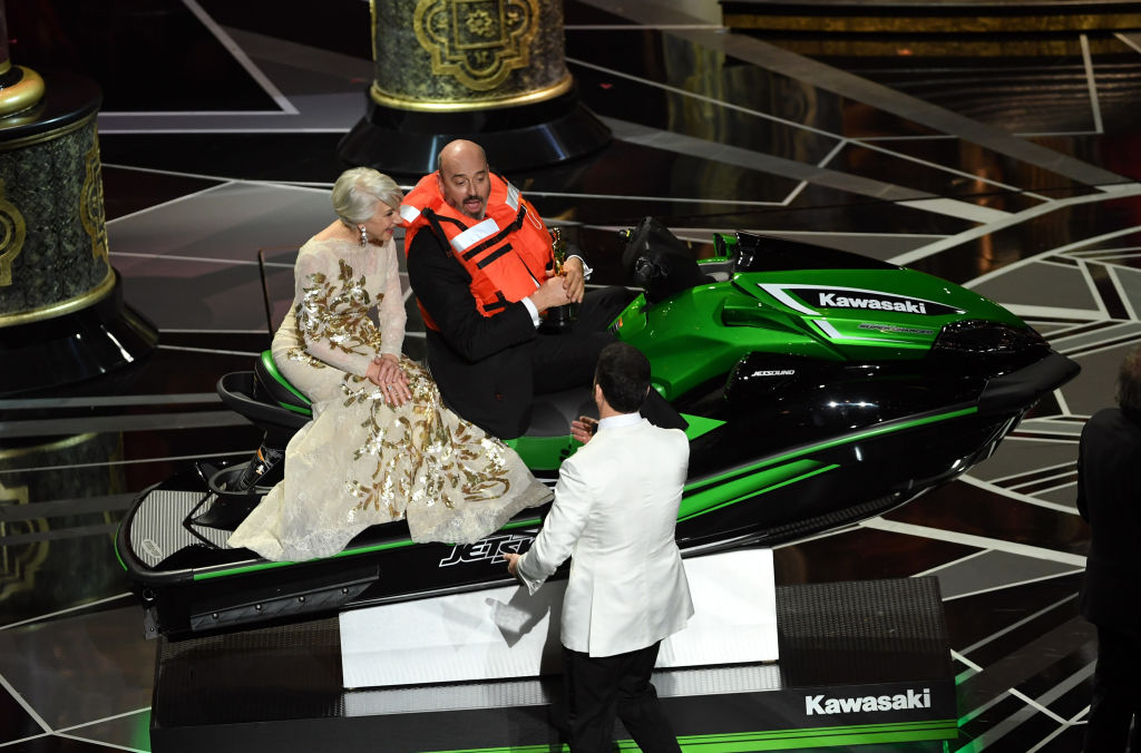 After the show ended, Kimmel said costume designer Mark Bridges had won the fabulous prize with a 36-second speech. Bridges worked on “Phantom Thread.” Bridges and Mirren made an appearance on the jet ski, with a delighted Bridges wearing a life vest over his tuxedo.