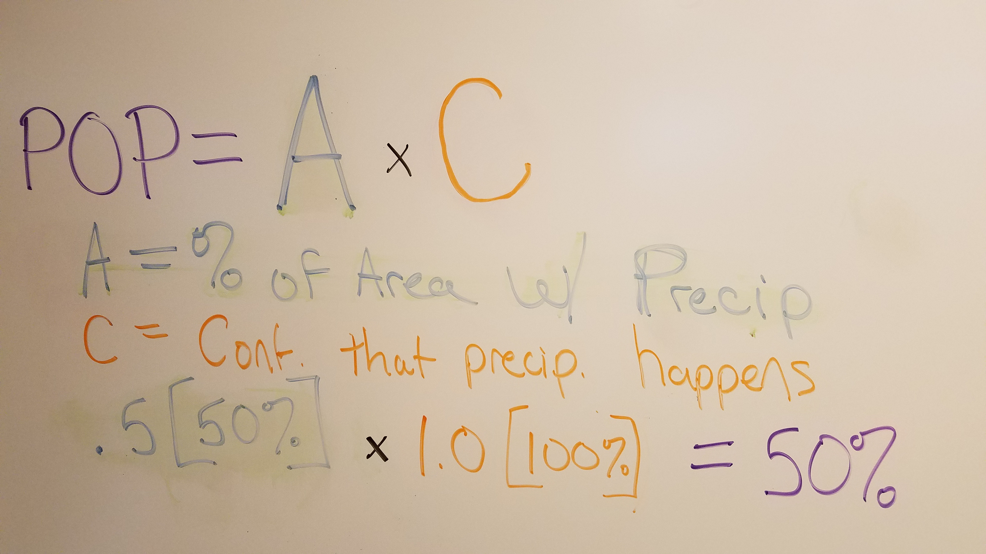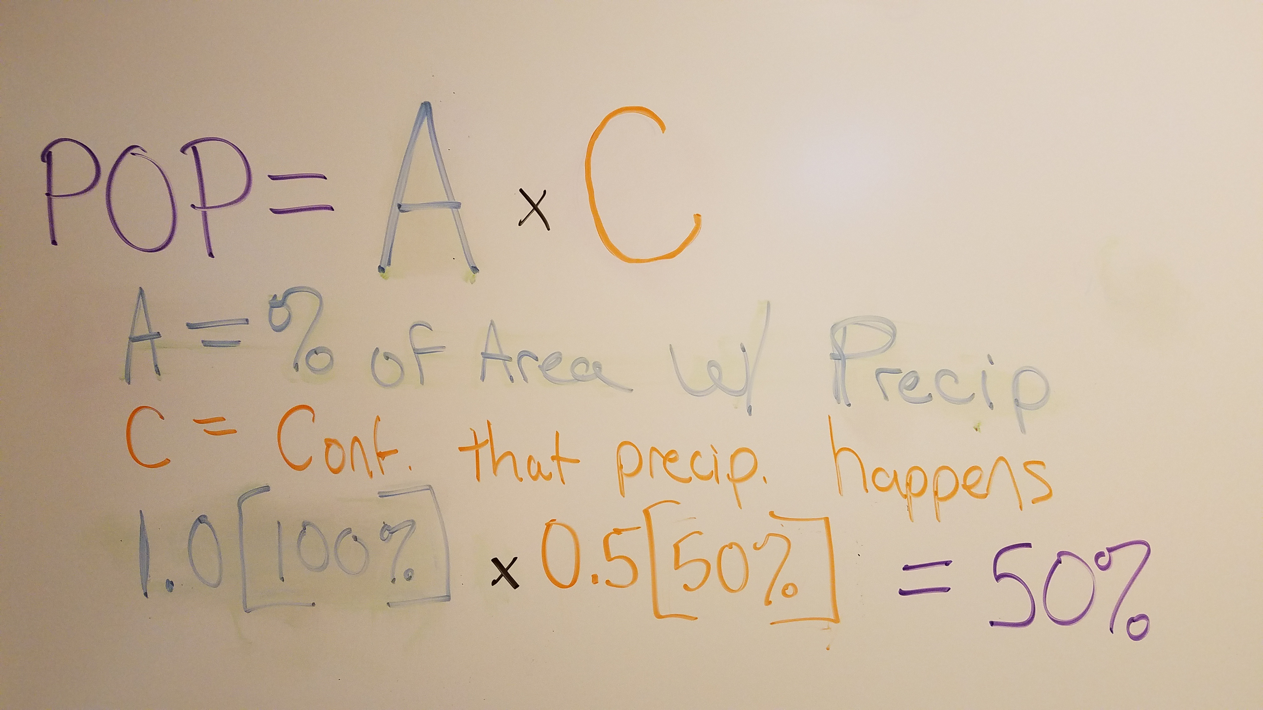 So for example, if I was 100% certain a cold front was going to bring rain for everyone north of I-70, assuming that is half our area.  The math would be POP= .50 (50% of area) x 1.0 (100% confidence) = 50% chance of rain