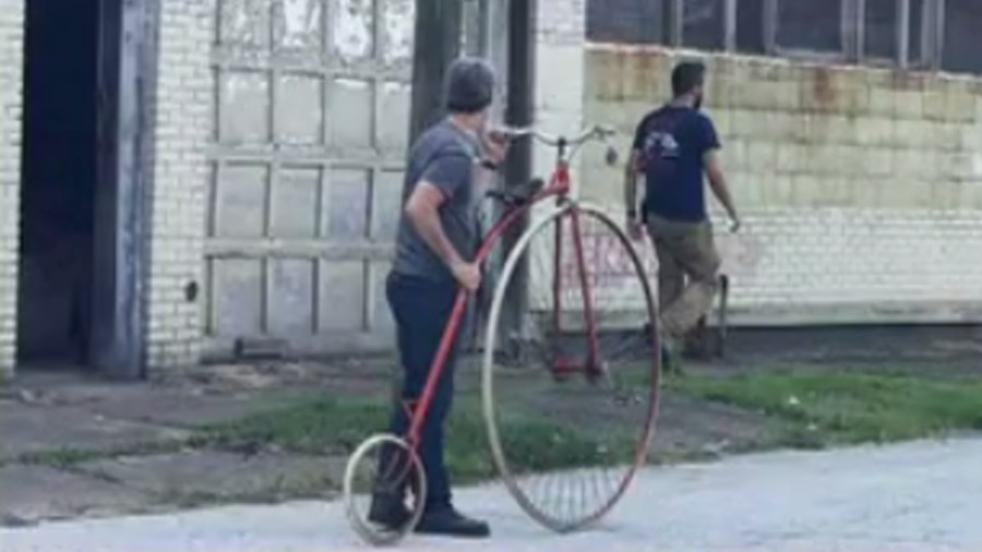 Ryan James, of Newton Falls, drove by and photographed Mike getting ready to mount a high wheel bike and then caught him taking it for a spin.