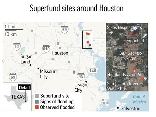 EPA spokeswoman Amy Graham could not immediately provide details on when agency experts would inspect the Houston-area sites. She said Friday that staff had checked on two other Superfund sites in Corpus Christi and found no significant damage.