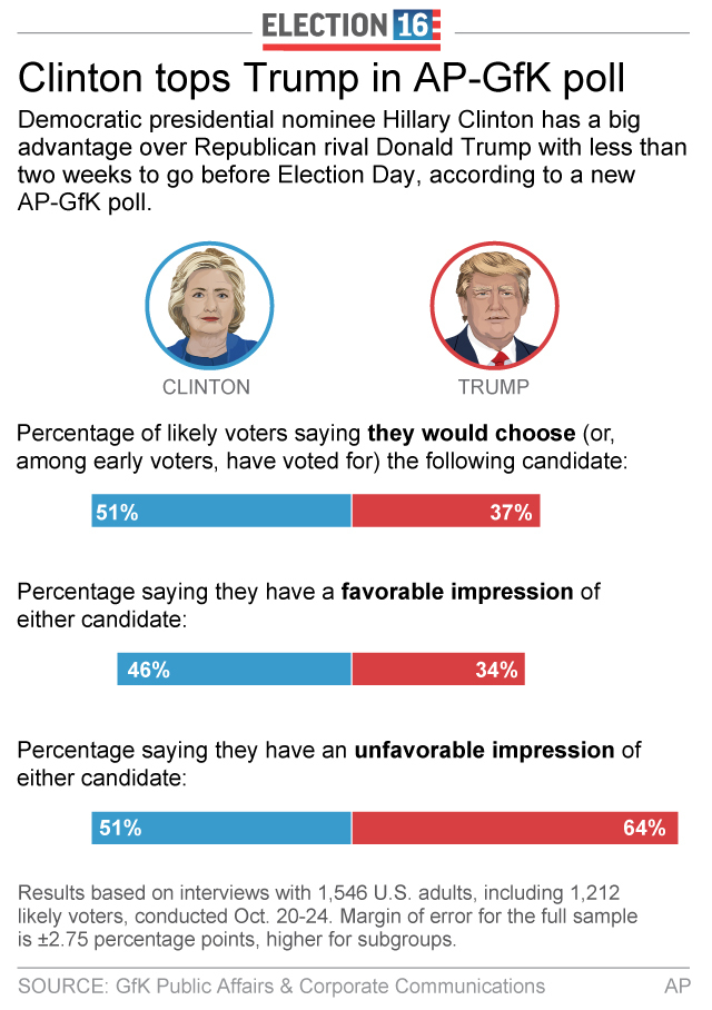 A new Associated Press-GfK poll released Wednesday finds the Democratic nominee has grabbed significant advantages over her Republican rival with just 12 days left before Election Day. Among them: consolidating the support of her party and even winning some Republicans.