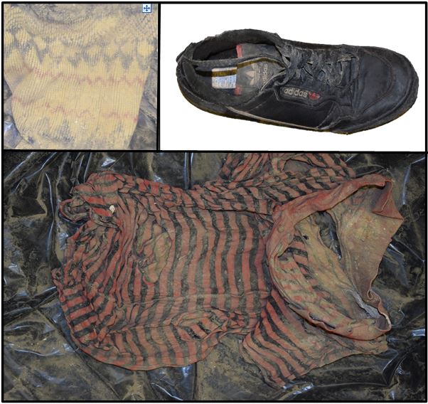 The man was found wearing “a pair of Dakota jeans, boxer shorts, dark red ribbed socks, a short sleeved black and red striped shirt, a multicolored knitted sweater with diamond and zigzag designs, a flannel shirt, and a pair of black Adidas Continental tennis shoes, size 9.5.”