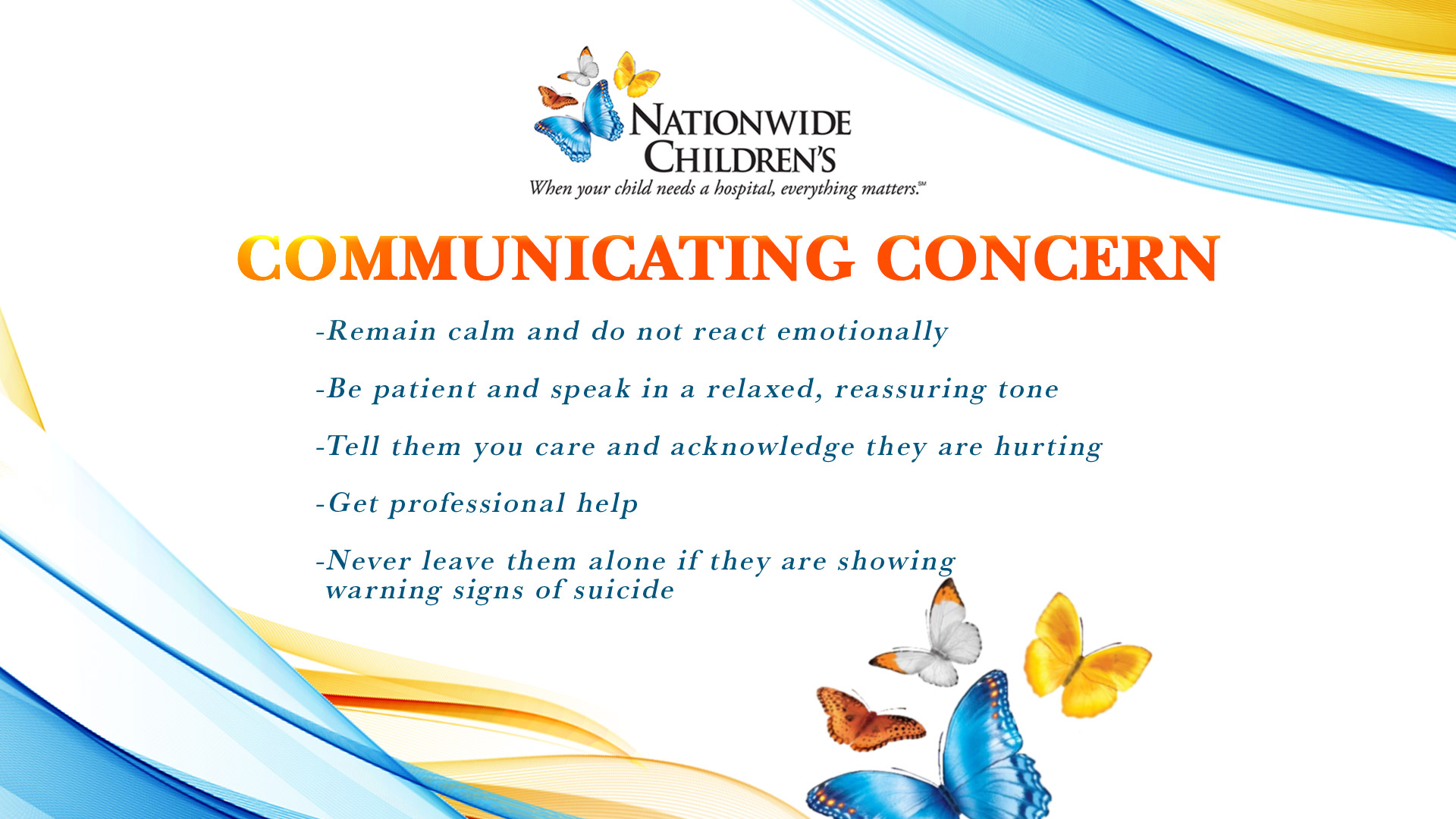 If someone you care about is in an emergency, life-threatening situation, call 9-1-1 or go to an emergency department. For crisis situations that are not life-threatening, please call your county’s psychiatric crisis line number. In Franklin County, call (614) 722-1800 for youth and adolescents 17 and under. Ages 18 and older should call (614) 276-2273. If someone you care about is having thoughts of suicide or needs to talk, encourage them to contact the National Suicide Prevention Lifeline at 1-800-273-8255. If you prefer to text, you can text “START” to 741-741 where a live, trained specialist will respond back to you.