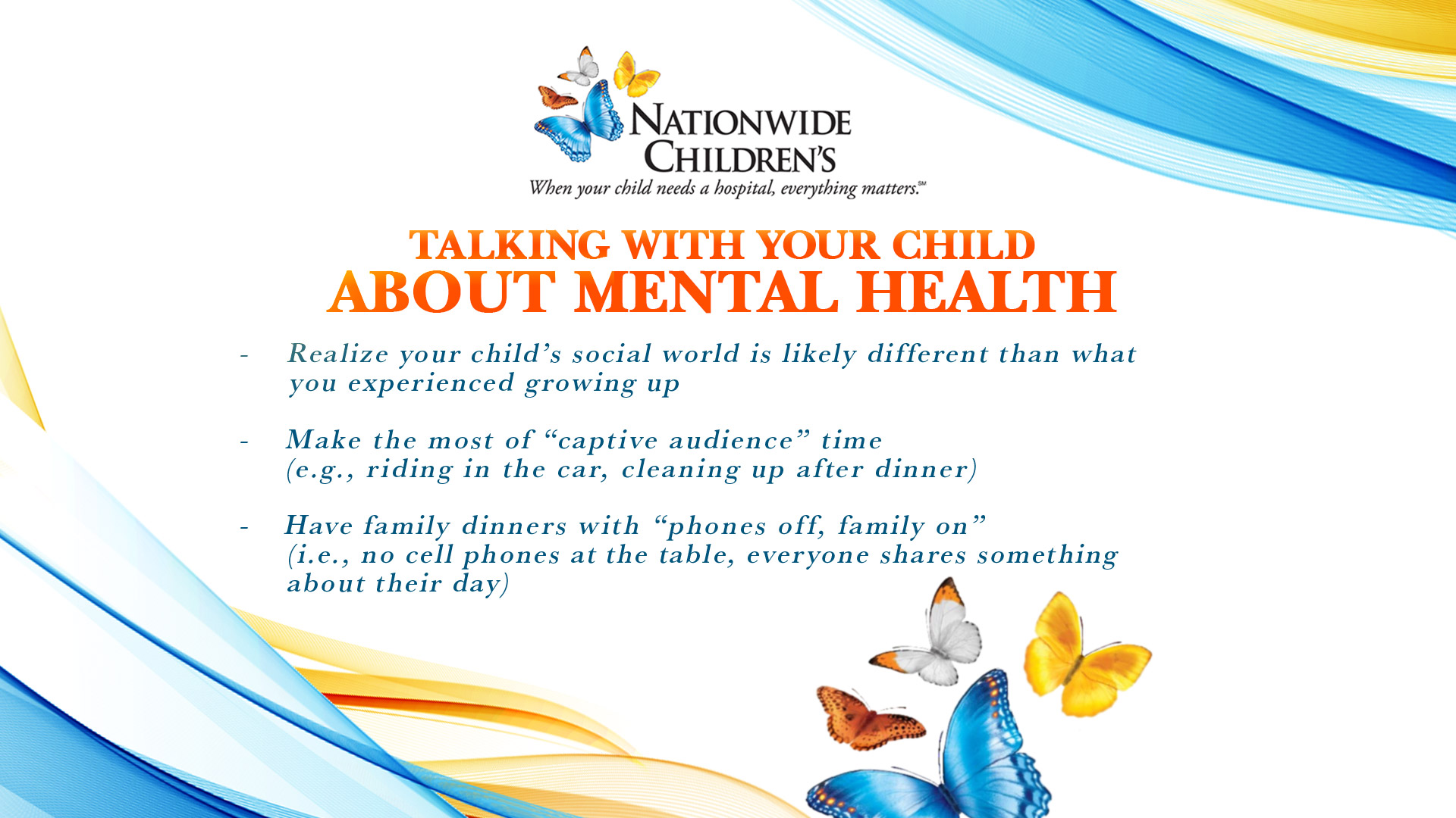 Screening for depression and suicide is also done throughout the hospital for youth age 10 to 17 who present for behavioral health reasons as part of our effort to eliminate the preventable risk of all types here at Nationwide Children’s.