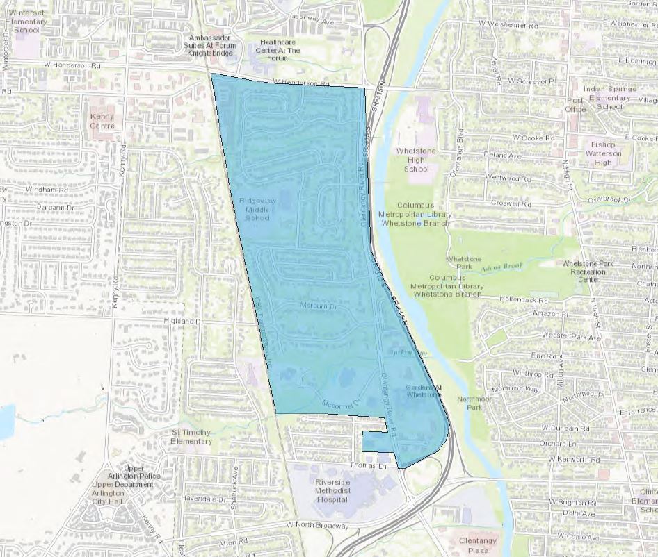 - South: Exit ramp from SR 315 southbound to Olentangy River Road to the east of Olentangy River Road, and McConnell Drive to the west of Olentangy River Road