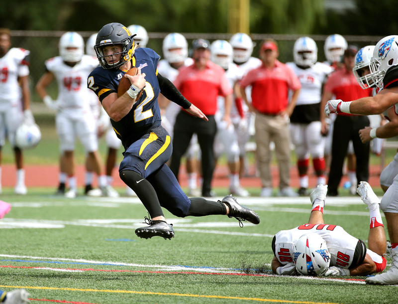 Bronson’s off-field heroics came just hours after he piled up nearly 400 yards in total offense and ran 60 yards for a touchdown in a 37-34 home loss to Worcester Polytechnic Institute. His 192 yards rushing was the most ever by a quarterback at the Division III school. He also completed 21 of 32 passes for 195 yards and a touchdown, despite suffering what was later diagnosed as a separated right shoulder in the third quarter.