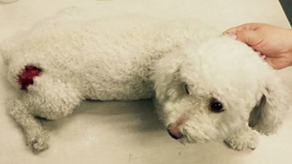 The poodle is being treated at a local veterinarian for puncture wounds and possible internal injuries.
