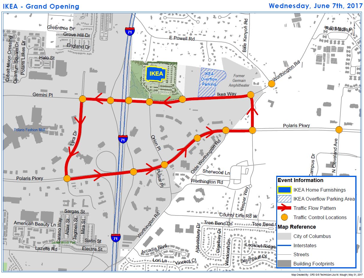 IKEA is located on the northeast corner of I-71 and Gemini Place.