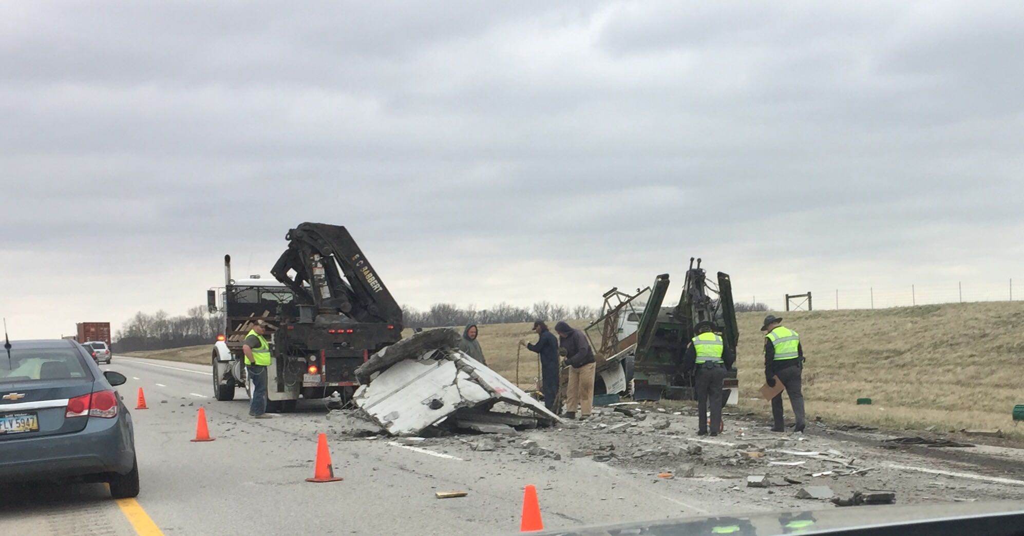 Troopers say no one was injured but the overpass is closed. U.S. 33 has one lane blocked while crews work to clean up.