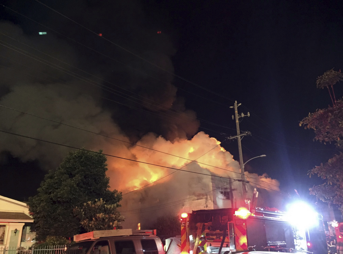 OAKLAND, CA (AP) -The death toll from a fire that tore through a warehouse hosting a late-night dance party jumped to 33 on Sunday as firefighters painstakingly combed through rubble for others believed to still be missing.