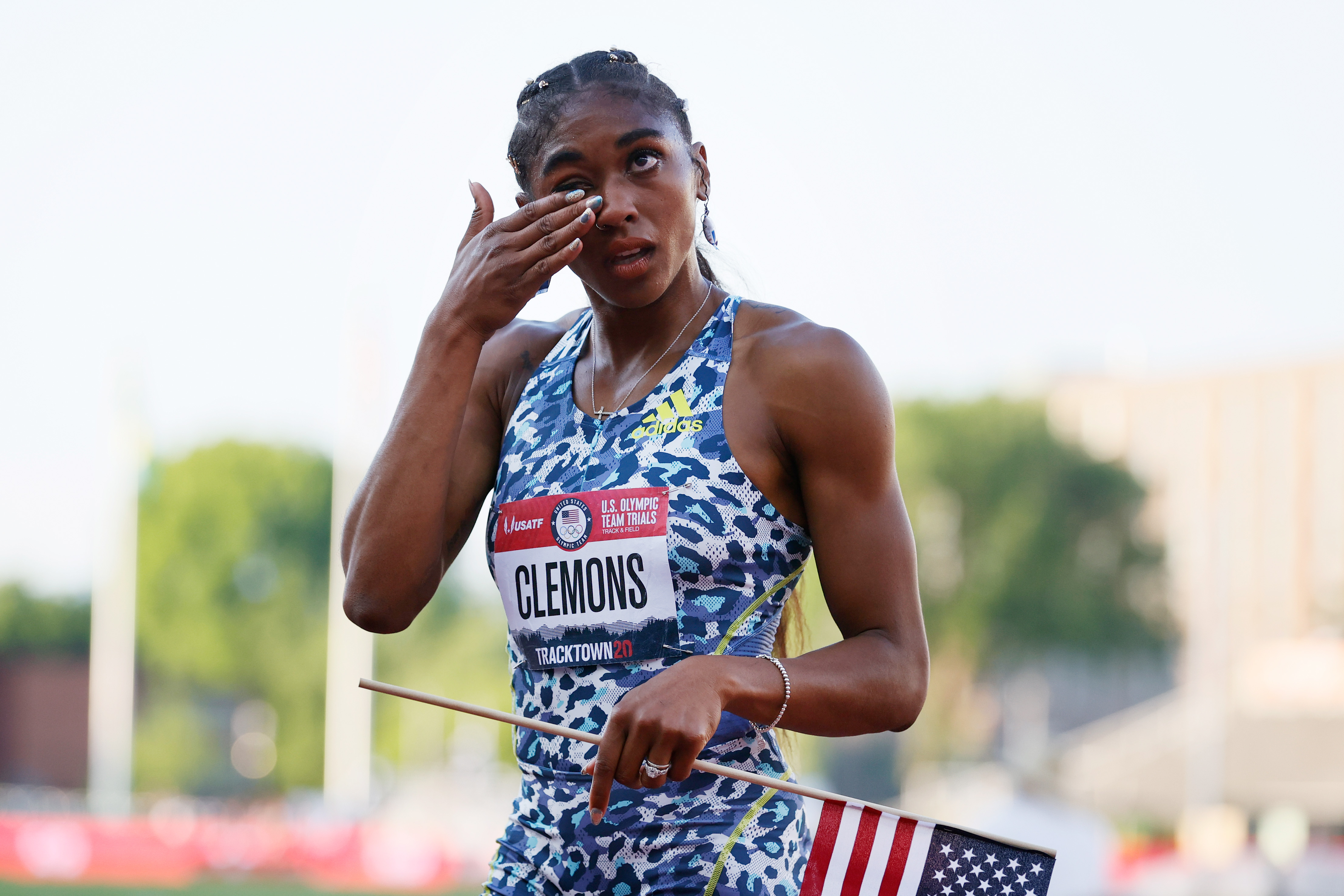 EUGENE, OREGON – JUNE 20: Christina Clemons cries after the Women’s 100 Meter Hurdles Final on day three of the 2020 U.S. Olympic Track & Field Team Trials at Hayward Field on June 20, 2021 in Eugene, Oregon. (Photo by Patrick Smith/Getty Images)