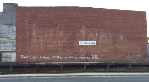 Similar graffiti was found a quarter-mile away on Fayetteville Street but also had the words “Wake up!” painted.