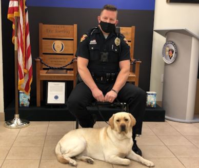 Officer Wojciechowski instructs the DARE program for fifth graders in Westerville schools. He’s now also Chloe’s canine handler.