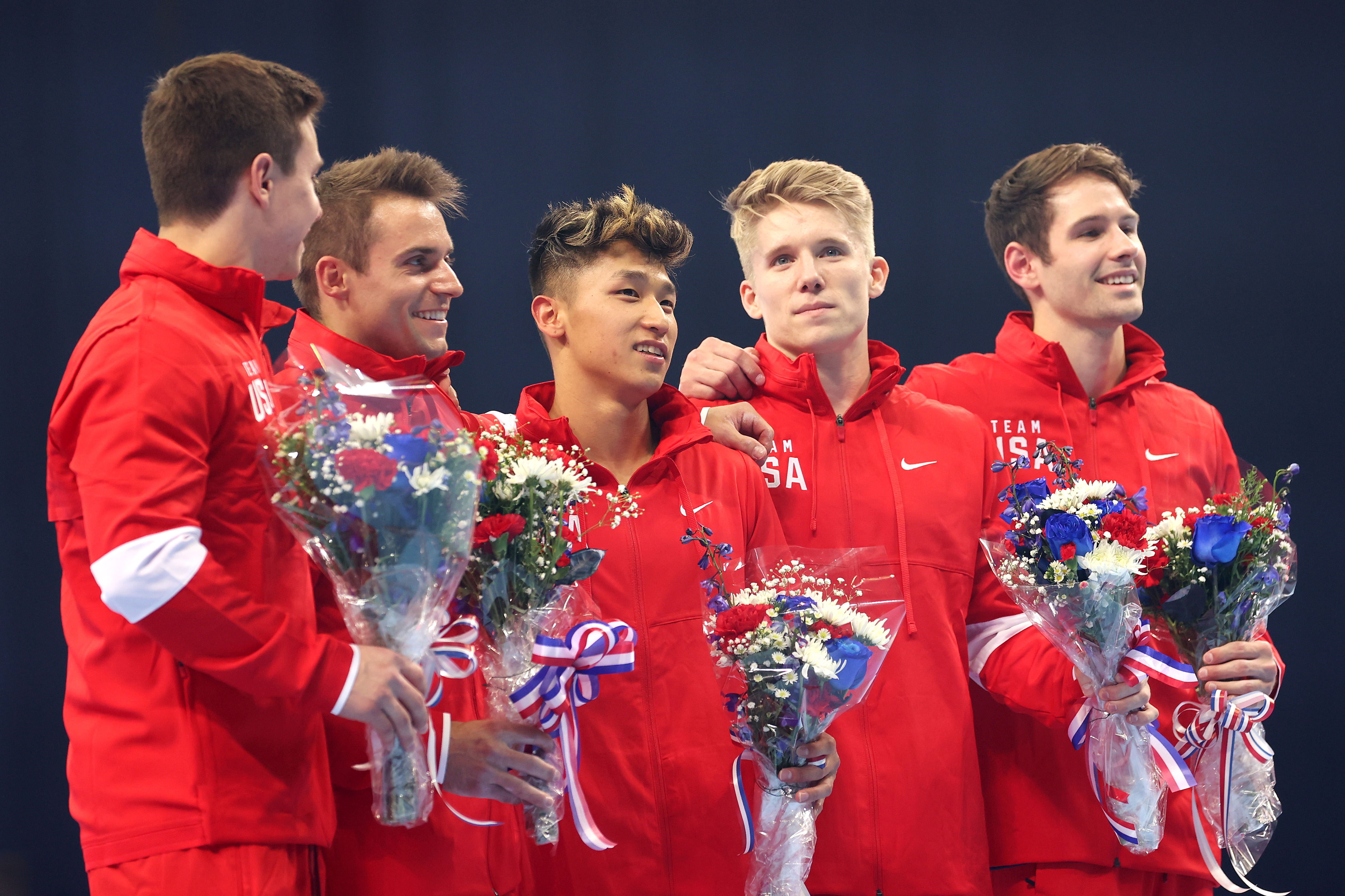 ST LOUIS, MISSOURI – JUNE 26: Brody Malone, Sam Mikulak, Yul Moldauer, Shane Wiskus and Alec Yoder pose after being selected to the 2021 U.S. Olympic Gymnastics team at the Men’s competition of the 2021 U.S. Gymnastics Olympic Trials at America’s Center on June 26, 2021 in St Louis, Missouri. (Photo by Carmen Mandato/Getty Images)