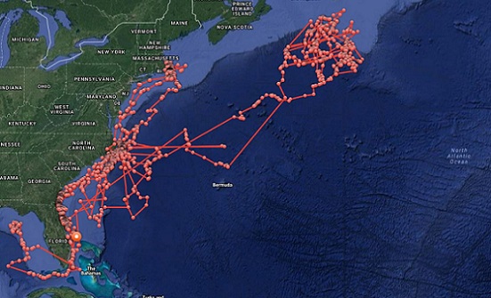The 14-foot-long, 2,300 pound-shark has logged 31087 miles since she was tagged in 2013, and has traveled all over the Atlantic Ocean; far off the coast of Nova Scotia, down to the Bahamas and back up to Bermuda.You too can track Katharine by clicking here.