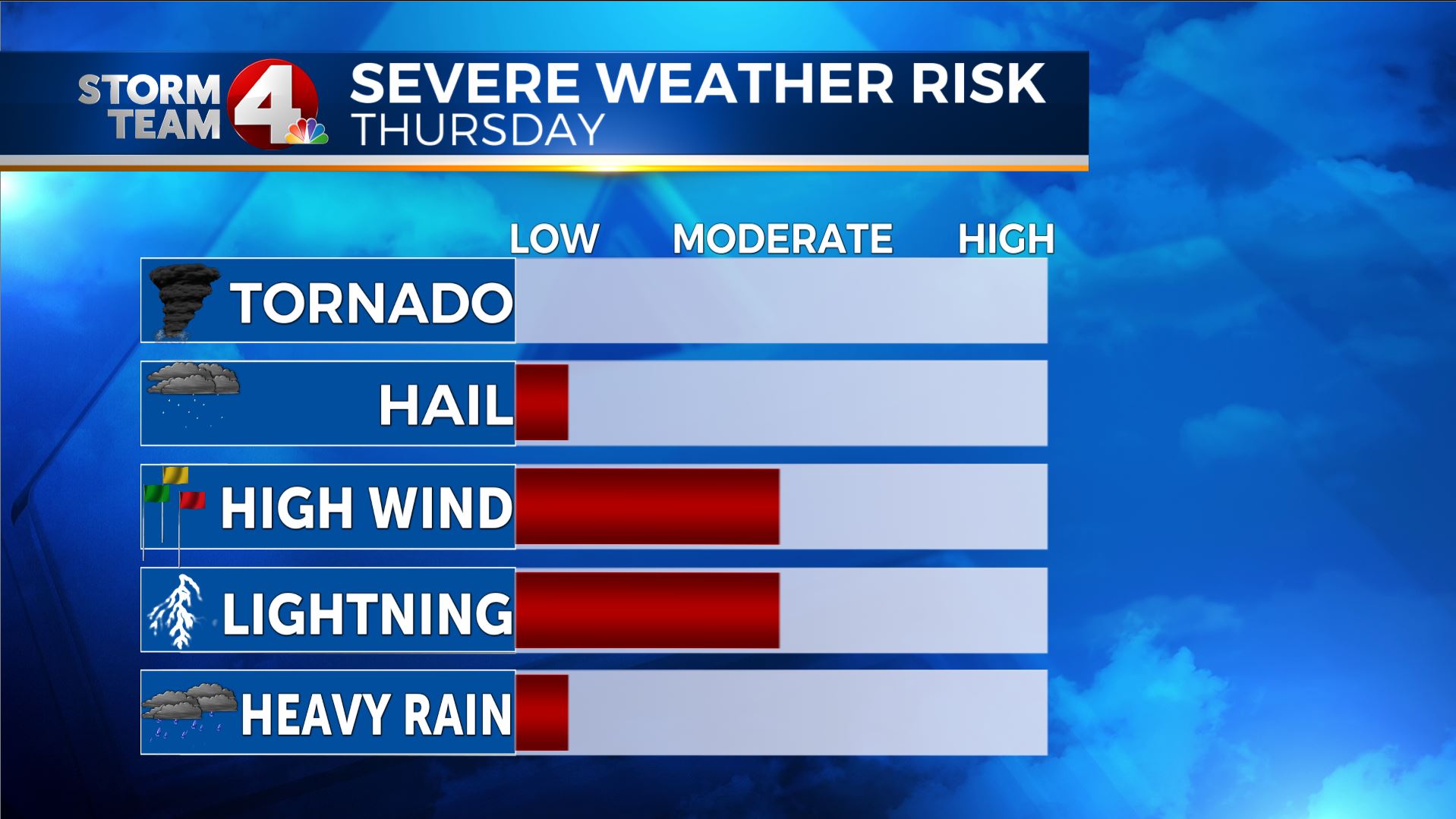 The main threats will be between late morning and late afternoon/early evening (east) for lightning and strong gusty winds with some of these storms, that is why we are under a “Marginal Risk” for severe storms on Thursday.