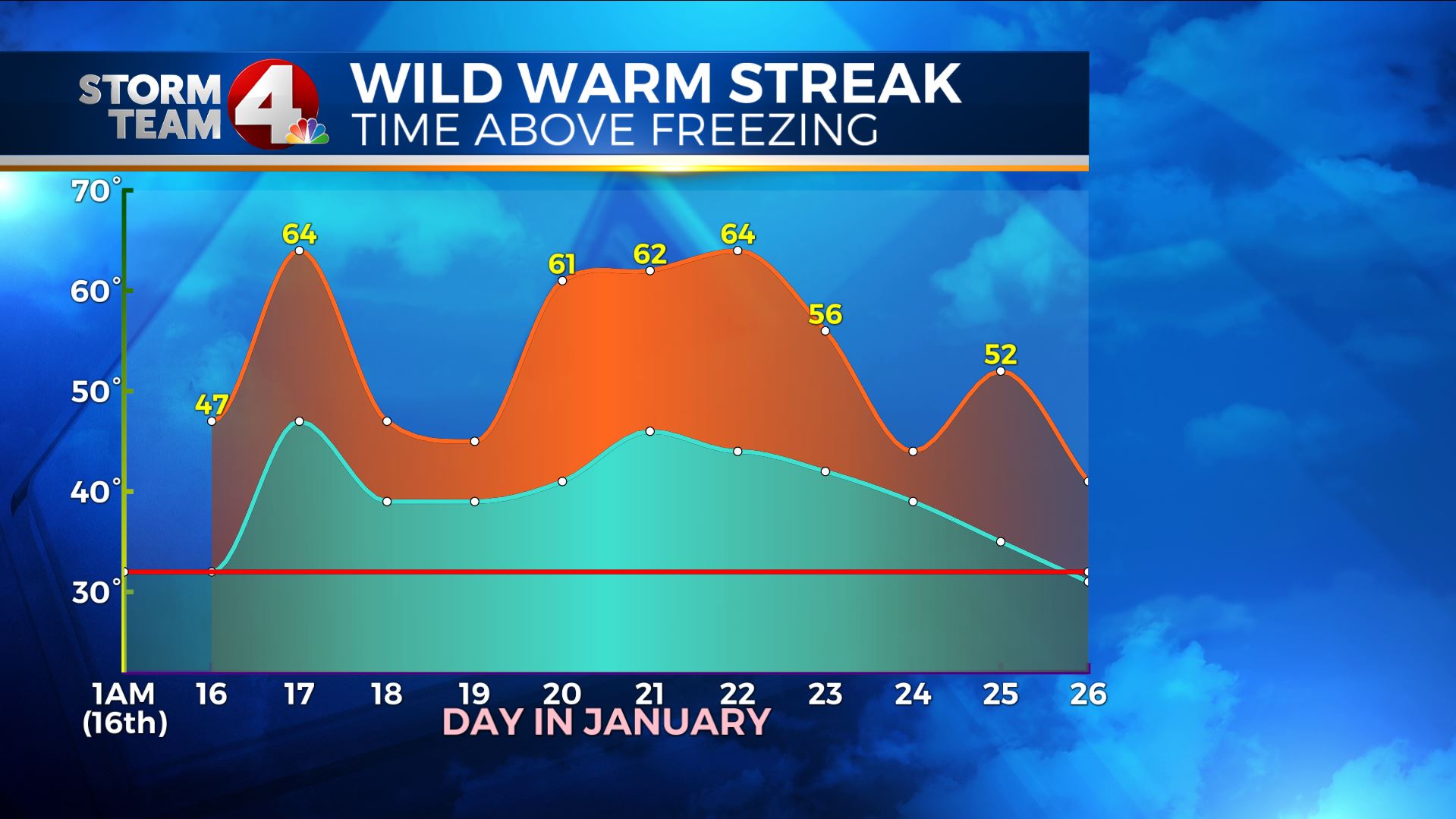 On this chart above, the orange is the high temperatures every day and the blue is the low temperatures. The red line is the freezing mark, and the very bottom of the chart is our normal low temperature.This is how many days in a row each January had at or above freezing: