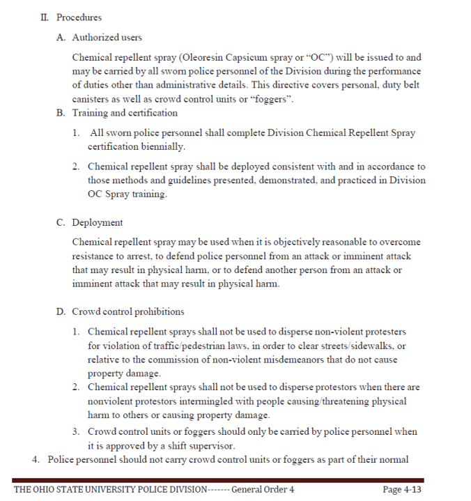 Ohio State said a spokesperson was unavailable on Monday, but did send a copy of the school’s pepper spray deployment policy, which can be seen below.