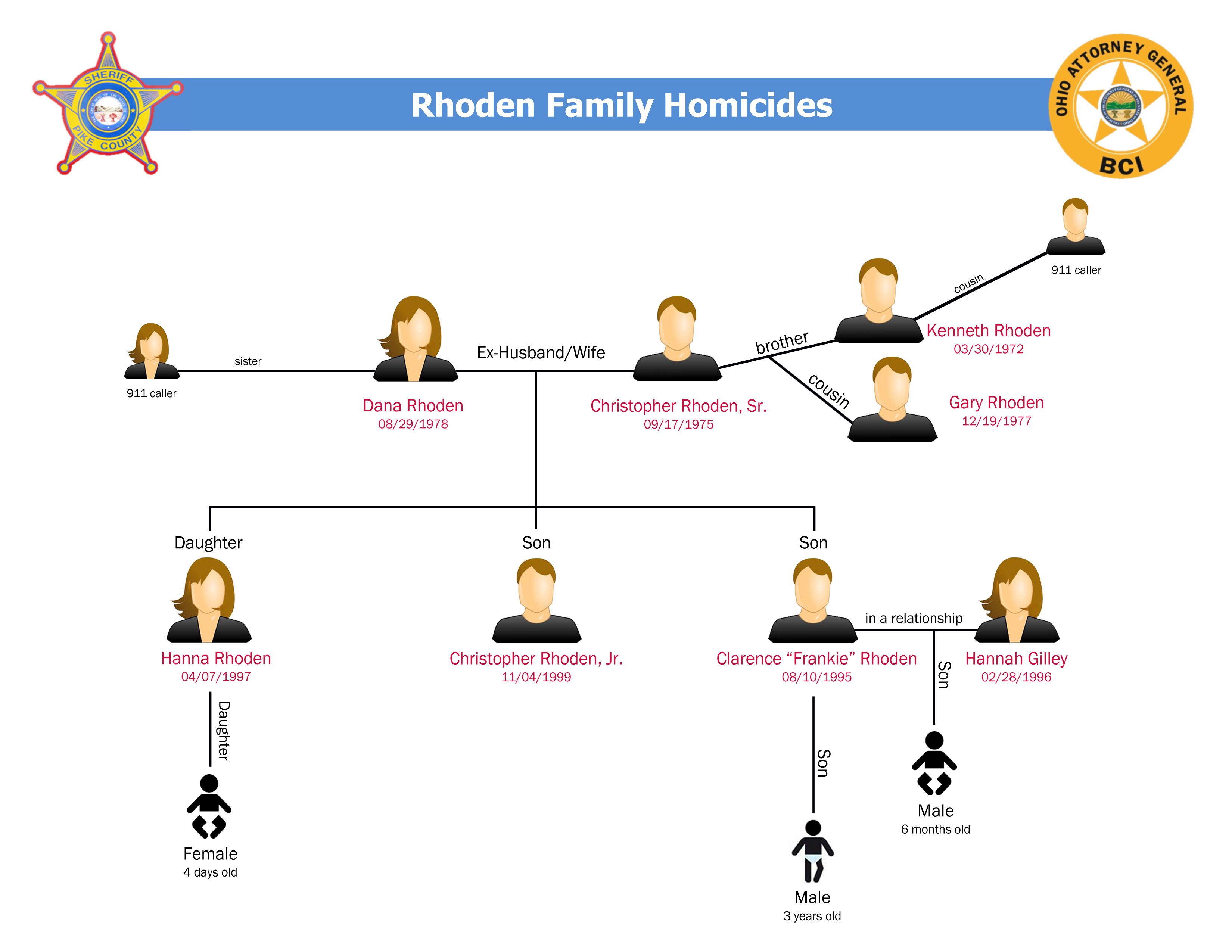 The victims were identified as 40-year-old Christopher Rhoden Sr.; his ex-wife, 37-year-old Dana Rhoden; their three children; Christopher Rhoden Sr.’s brother, 44-year-old Kenneth Rhoden; their cousin, 38-year-old Gary Rhoden; and 20-year-old Hannah Gilley, whose 6-month old son with “Frankie” was unharmed.