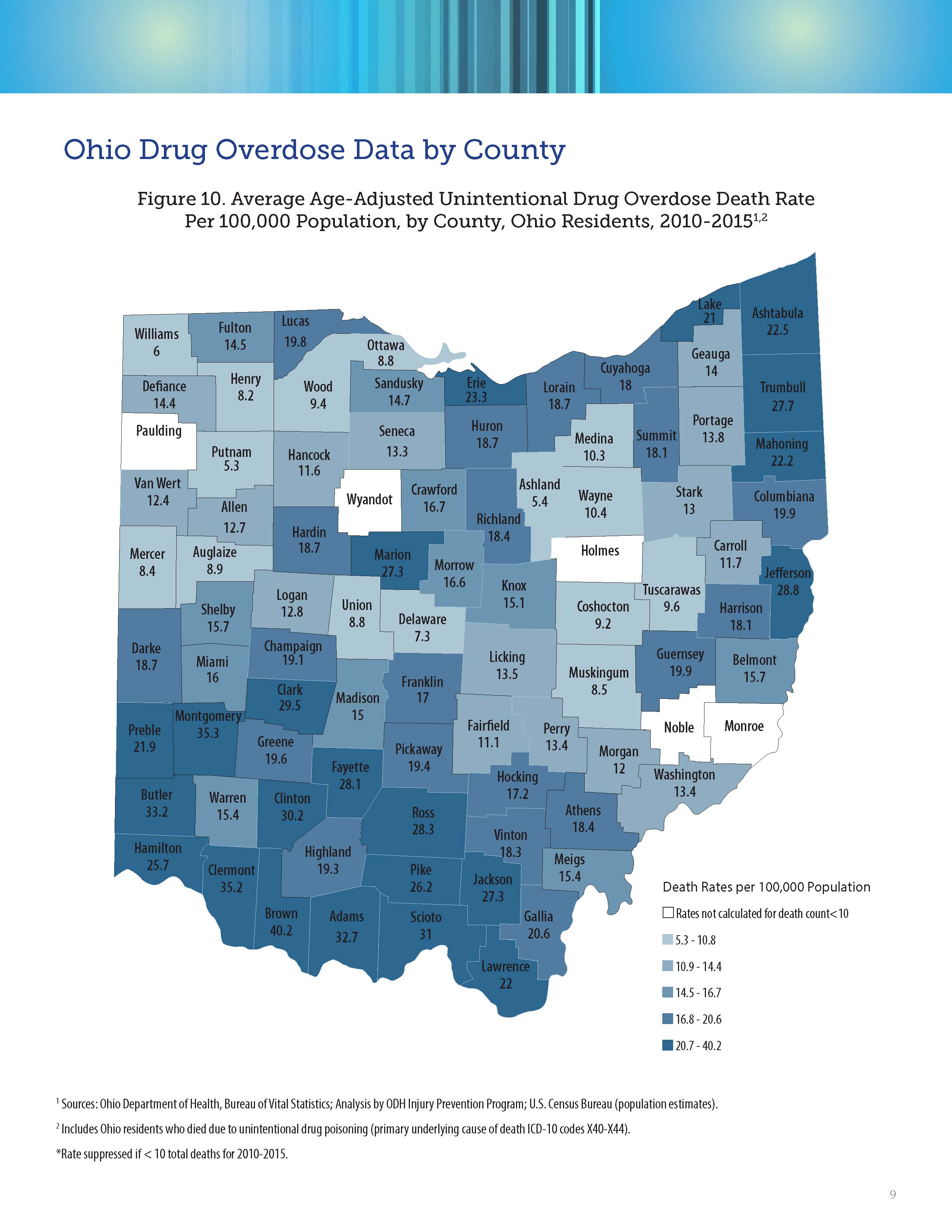 *Sources: Ohio Department of Health, Bureau of Vital Statistics; Analysis by ODH Injury Prevention Program; U.S. Census Bureau (population estimates).*Includes Ohio residents who died due to unintentional drug poisoning (primary underlying cause of death ICD-10 codes X40-X44).*Rate suppressed if < 10 total deaths for 2010-2015