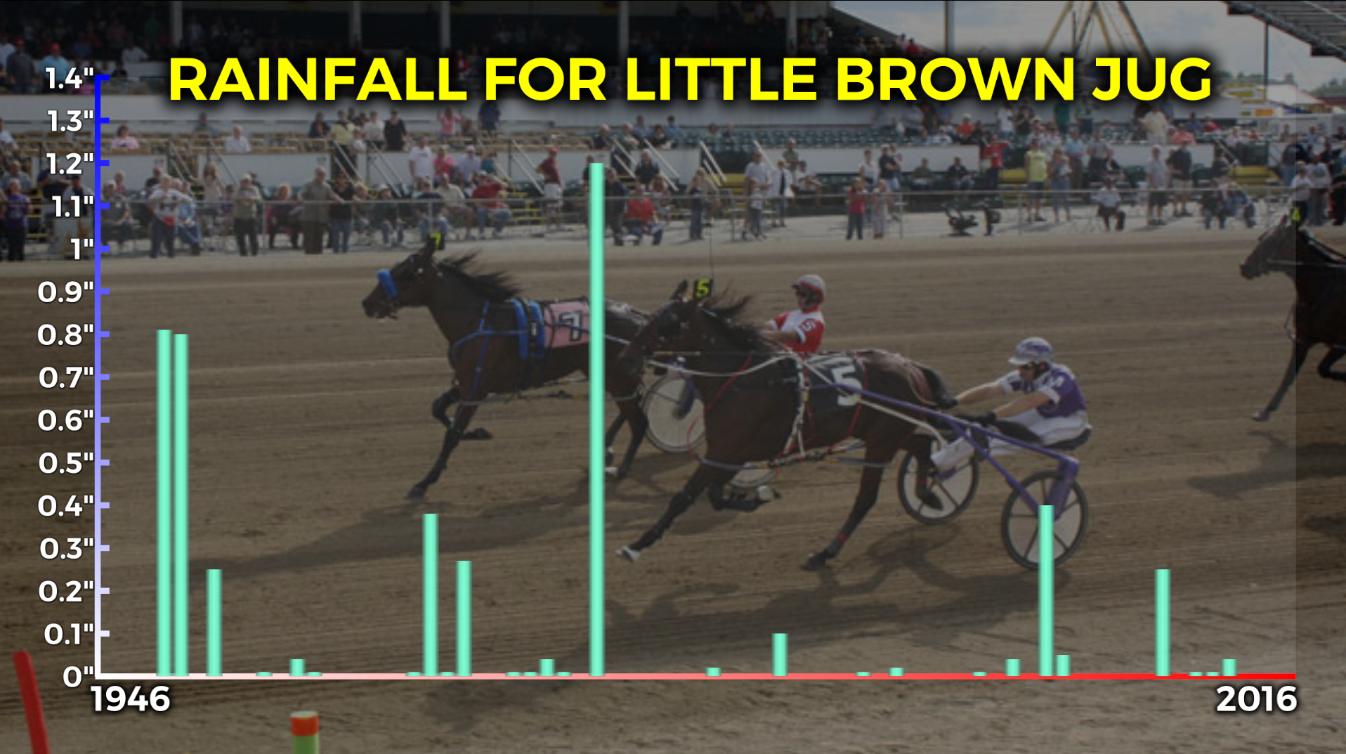 Below is a plot of the 27 of 71 years we had at least a trace of rain reported the day of the Little Brown Jug Race