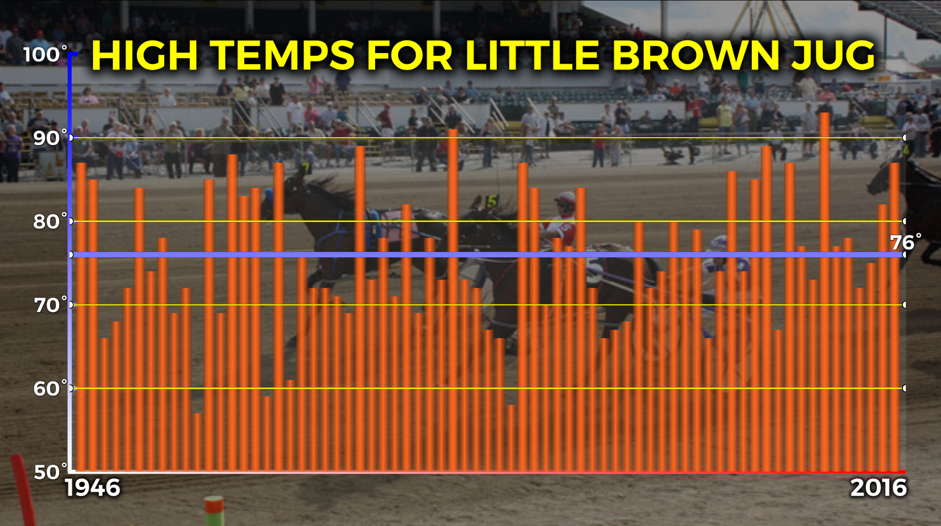 Delaware (WCMH) – Thursday the races for the Little Brown Jug will go on at the Delaware County Fair on the first day of Autumn. High temps will be well above normal on Thursday in the upper 80s, warm, but not the hottest ever recorded for the races (93 in 2010).Below is a plot of the 71 year running for the Little Brown Jug (1946-2016)