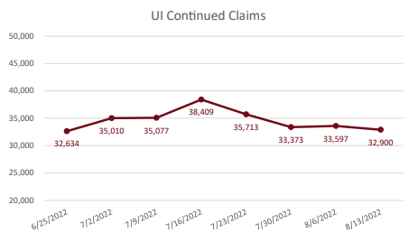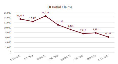 During the week of Sunday, Aug. 7 to Saturday, Aug. 13, Ohioans filed 6,227 new unemployment claims, 1,664 fewer than the week before, according to data released Thursday by the Ohio Department of Job and Family Services. The 32,900 continued unemployment claims filed over the same week-long period are down, too, by about 700 claims.