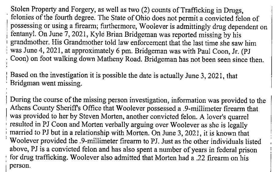 A breakthrough in the case came on Sept. 16, 2021, when Lindsay Coon Woolever, PJ Coon’s wife, was arrested in Nelsonville. The indictment mentions Bridgeman.