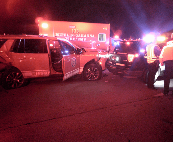 The Ohio Department of Public Safety crash report indicated that the police cruiser had its overhead beacon lights on while it was parked in front of the fire department vehicle. The Mifflin Township Division of Fire said that its vehicle also had emergency lights illuminated.