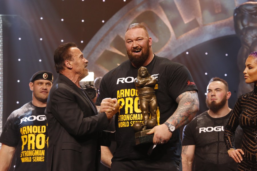 Hafthor Bjornsson wins The Arnold Strongman Classic with Gov. Arnold Schwarzenegger Photo by Dave Emery