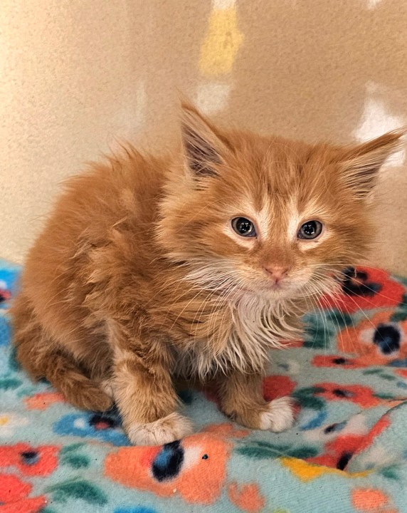 “I heard a kitten meowing and followed the sound until I found him,” said Mills. “He looked terrified, soaking wet, and shaking, so I brought him inside our main office and began drying him off as quickly as I could.”