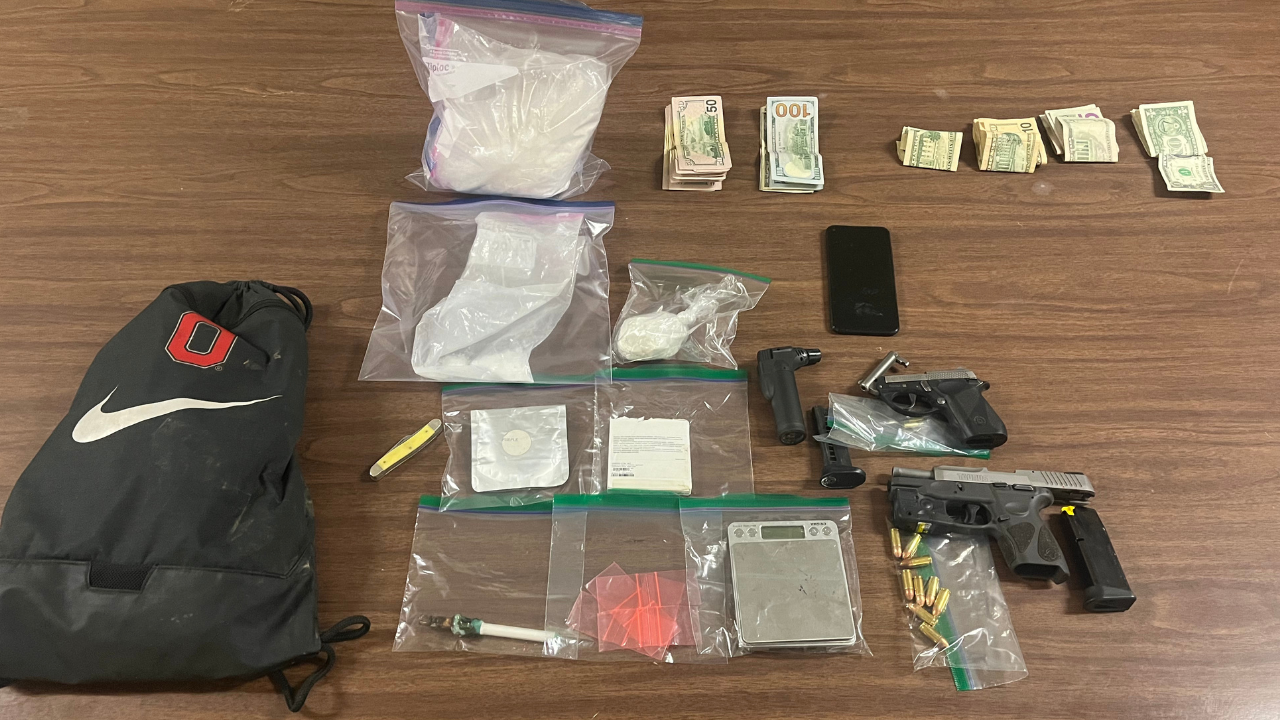 The deputy saw a firearm under the gear shift of the car and then searched the vehicle, per the sheriff’s office. He found a black drawstring bag with an Ohio State logo that contained over two pounds of meth, close to 0.2 pounds of cocaine, and a small amount of fentanyl. The total street value of the drugs found was more than $20,000, per the sheriff’s office.