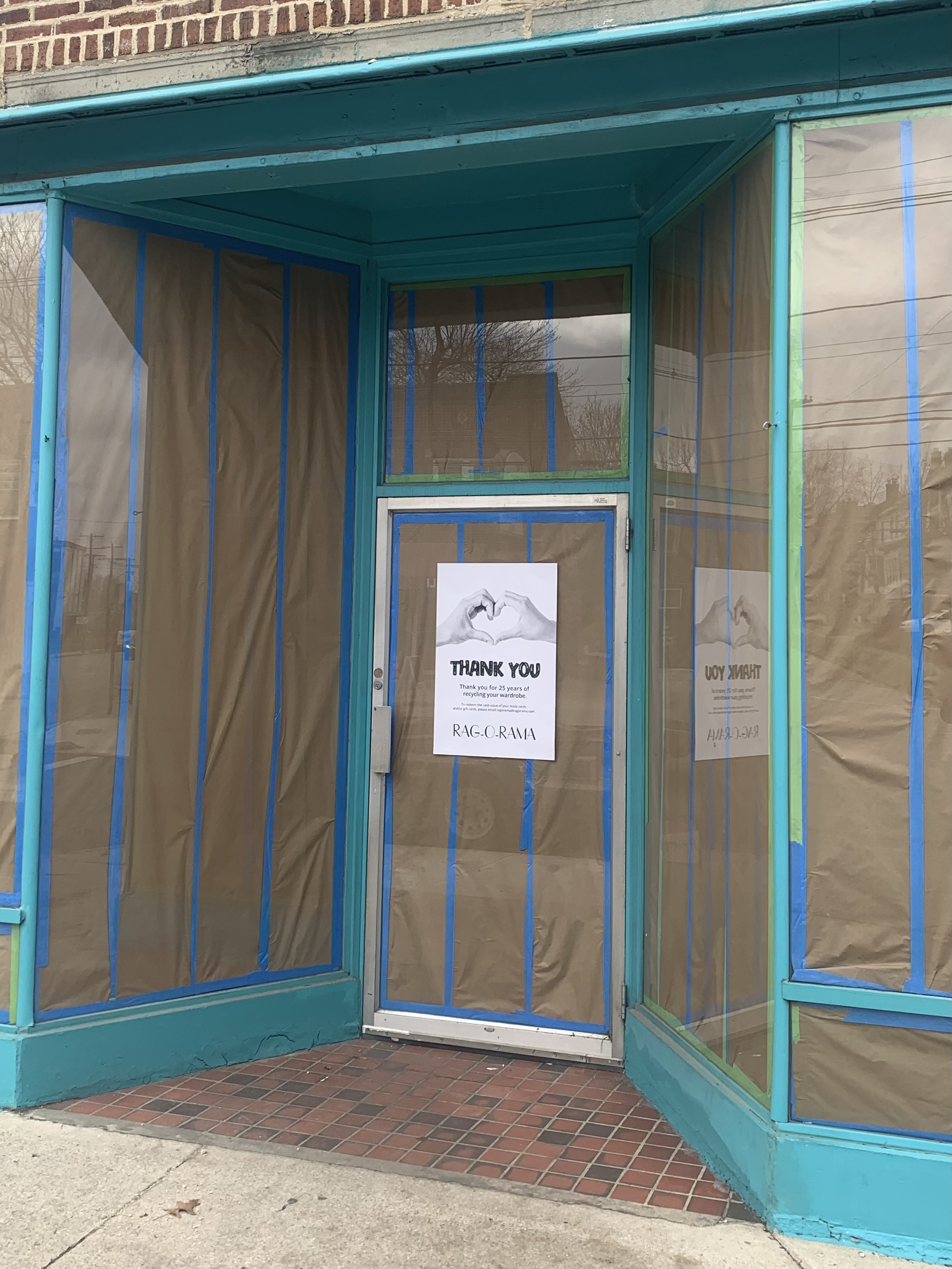 Workers from DāNite Sign Co. were seen loading the prominent red neon letters from the storefront onto a flatbed trailer attached to a pickup truck, and the windows have been covered. A sign on the front door read, “Thank you for 25 years of recycling your wardrobe. To redeem the cash value of your trade cards and/or gift cards, please email ragorama@ragorama.com”.